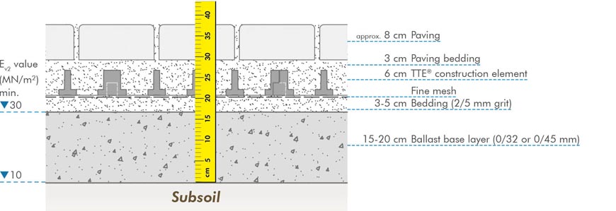 Using TTE® as a base course layer stabilisation one saves the costs of extensive base course layers. TTE® is the ideal solution above all for poor load carrying capacity or inhomogeneous building ground. The high load-bearing geo-grid forms a rigid load distributing substrate and guarantees permanent flatness of the paving stone and slab coverings and also ensures a high drainage performance.